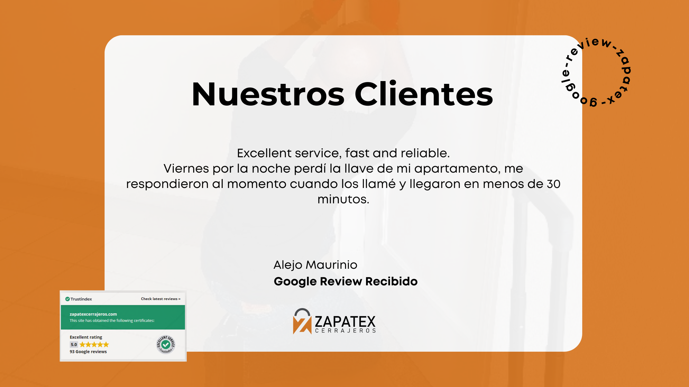 “Excellent service, fast and reliable. Viernes por la noche perdí la llave de mi apartamento, me respondieron al momento cuando los llamé y llegaron en menos de 30 minutos.”