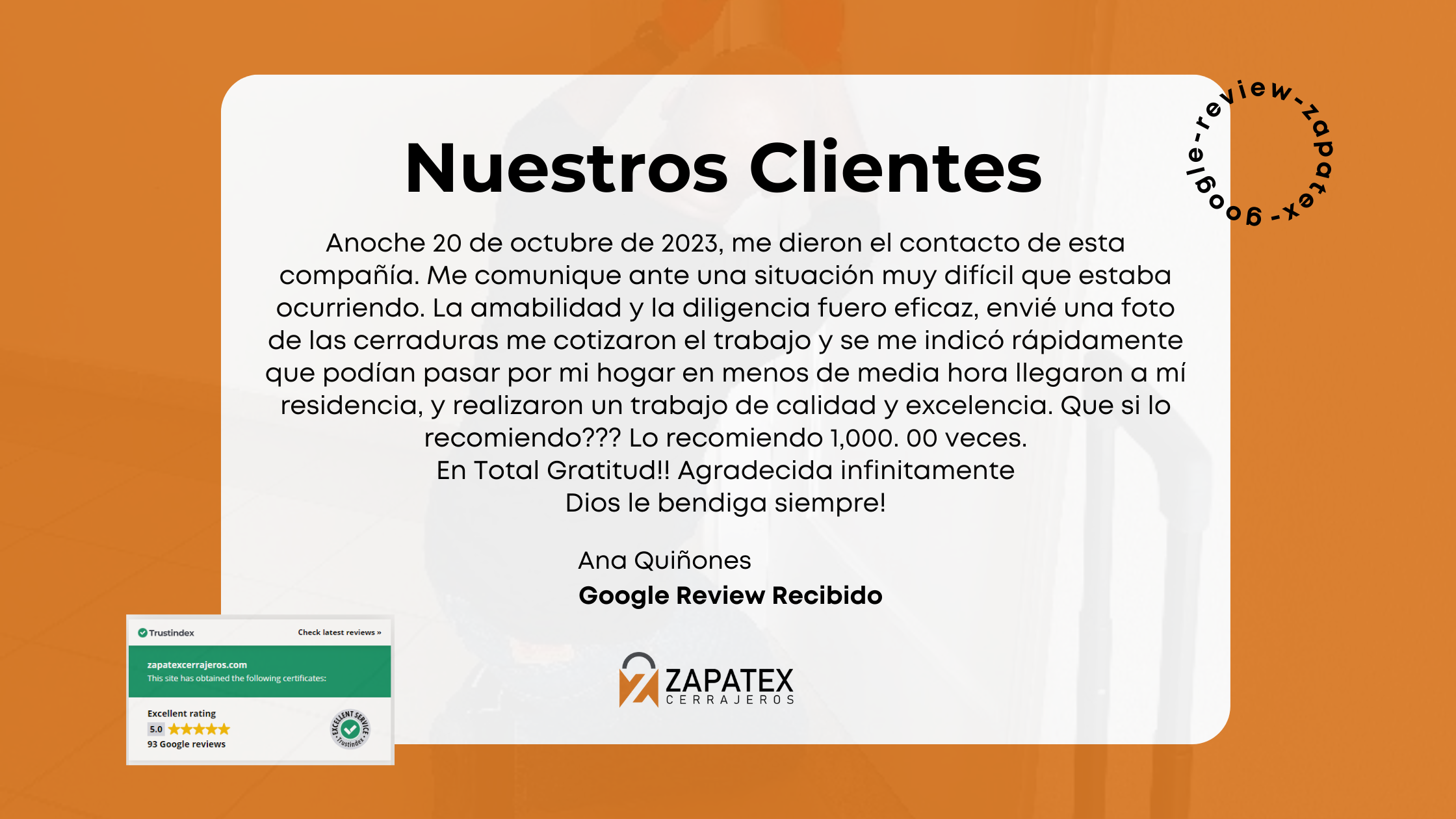 En Zapatex Cerrajeros, cada trabajo se ejecuta con los más altos estándares de calidad. Ana destacó que realizamos un trabajo de calidad y excelencia, reflejando nuestra dedicación absoluta a superar las expectativas de cada cliente.