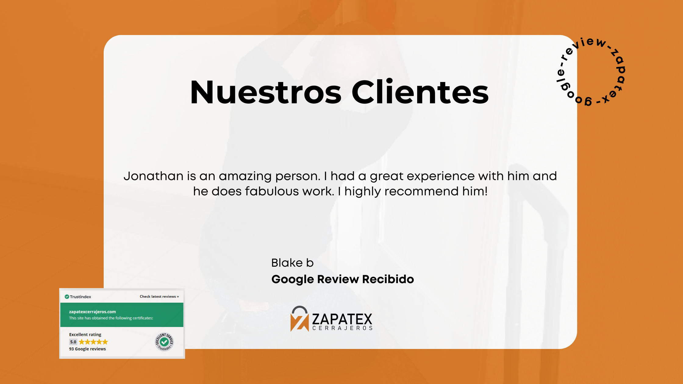 Blake necesitaba asistencia profesional y eligió a Zapatex Cerrajeros. Jonathan demostró que la calidad excepcional y la atención personalizada pueden combinarse perfectamente para ofrecer resultados extraordinarios en cada proyecto.