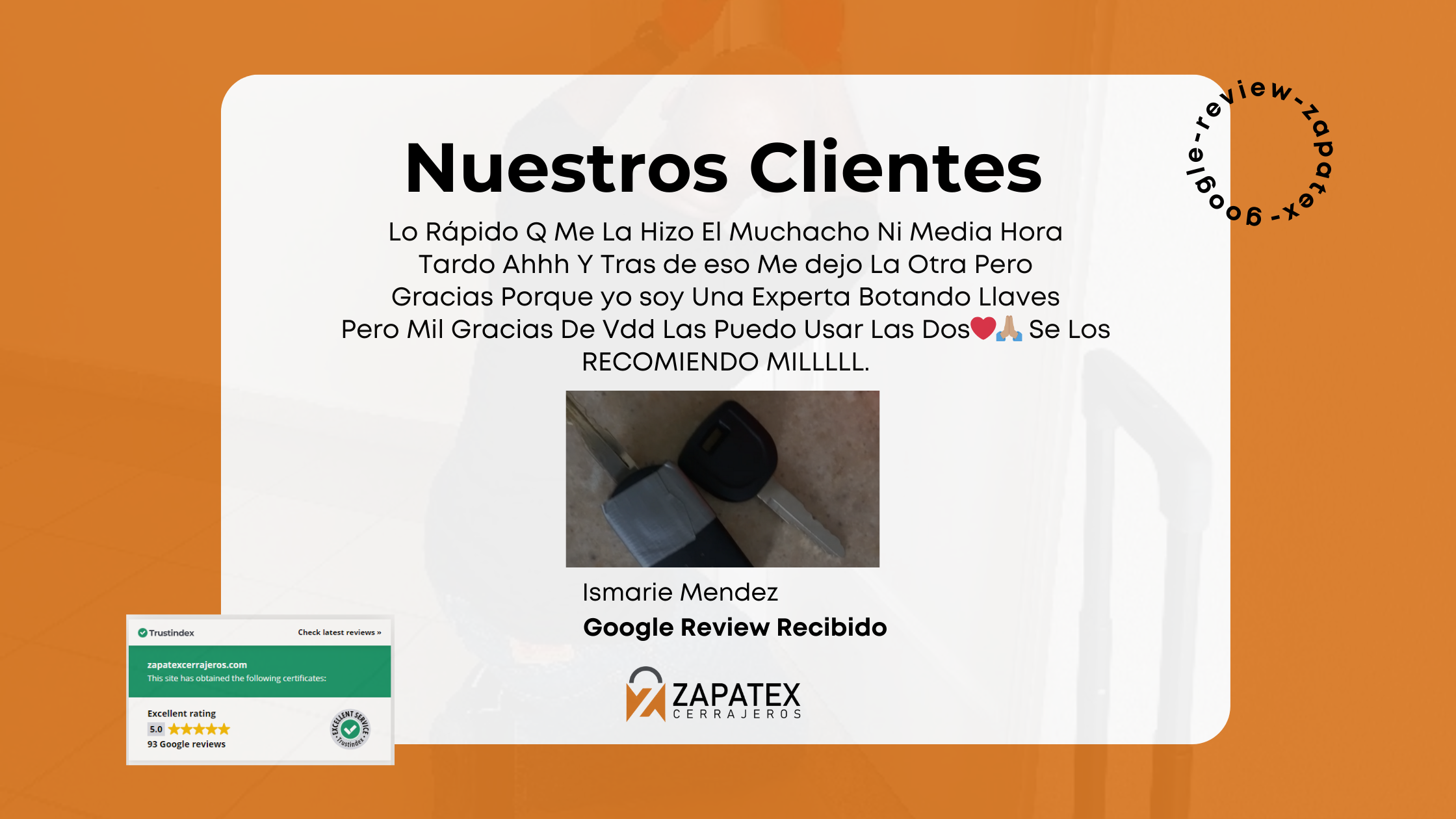 Ismarie necesitaba resolver un problema de cerrajeria urgente con sus llaves y eligió a Zapatex Cerrajeros por nuestra reputación de excelencia y rapidez. Nuestro técnico respondió a su llamado demostrando el nivel de profesionalismo que nos caracteriza.