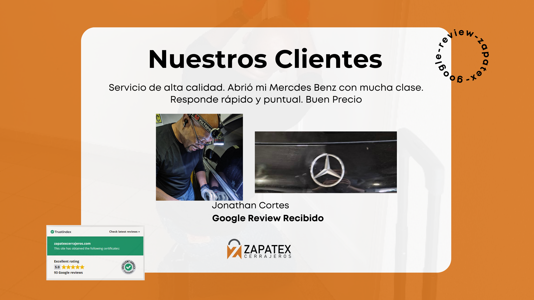 “Servicio de alta calidad. Abrió mi Mercedes Benz con mucha clase. Responde rápido y puntual. Buen Precio.”