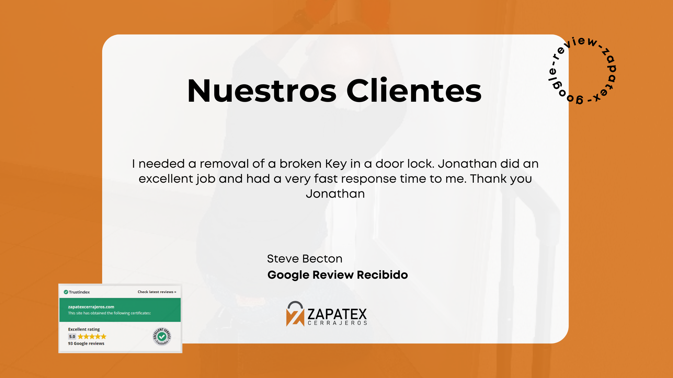 En Zapatex Cerrajeros, garantizamos tiempos de respuesta rápidos para todas las emergencias. Steve experimentó nuestra eficiencia: respuesta inmediata y trabajo excelente que resolvió su problema sin complicaciones adicionales.